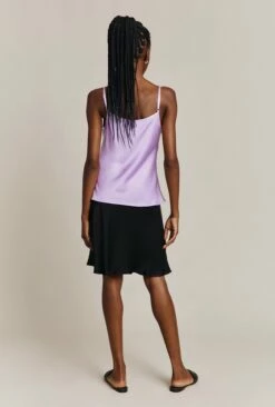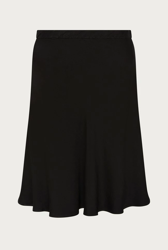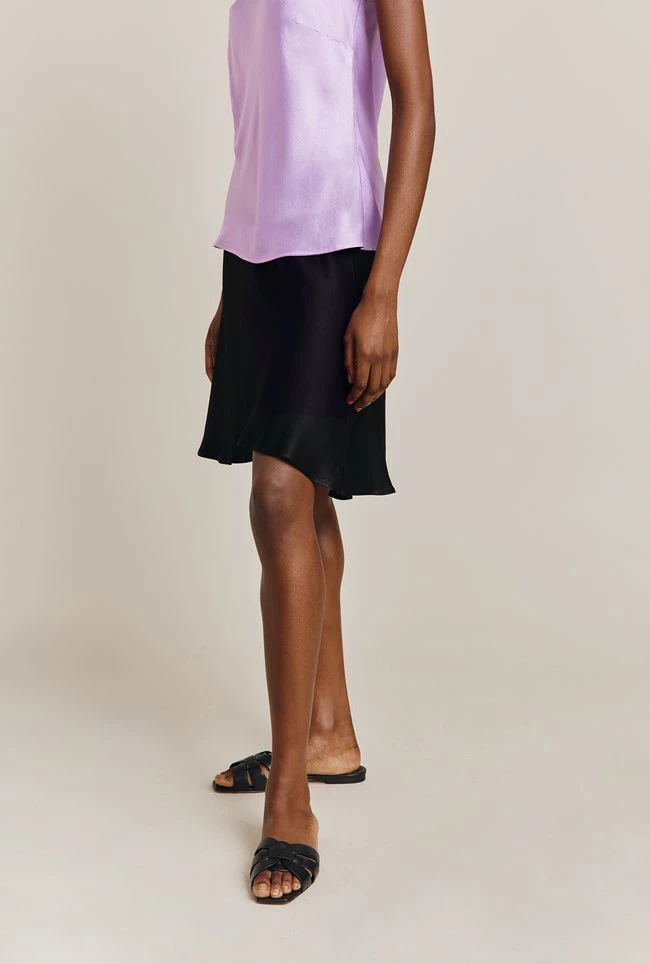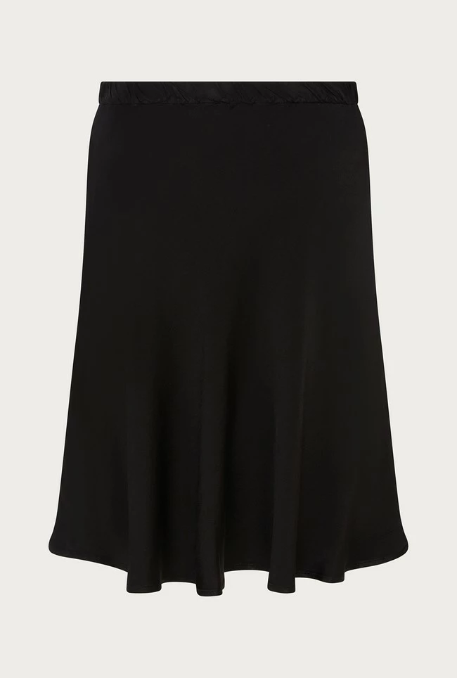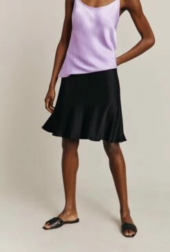 A play on our classic Luna skirt, our Arella black skirt is cut on the bias in a mini length and crafted in garment-dyed satin so it falls fluidly over the body to create a flattering, form-fitting silhouette. A subtly elasticated waistband ensures comfort. Dress up with a our Jana camisole and heels, or down with a simple tee, denim jacket and trainers – versatility is Arella’s superpower.