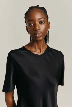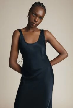A play on our classic Luna skirt, our Arella navy skirt is cut on the bias in a mini length and crafted in garment-dyed satin so it falls fluidly over the body to create a flattering, form-fitting silhouette. A subtly elasticated waistband ensures comfort. Dress up with a our Jana camisole and heels, or down with a simple tee, denim jacket and trainers – versatility is Arella’s superpower.