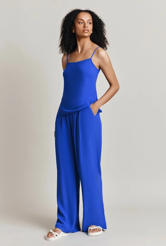 The companion to our Holly Cami, the Aria trousers are a clean-cut flared style with a slight bootcut, making them perfect when worn with heels. Crease detailing down from the waist complete the crisp tailored look. Made from our classic, they are elasticated at the back for a comfortable fit. Pair with a simple camisole or loose t-shirt for a causal look.