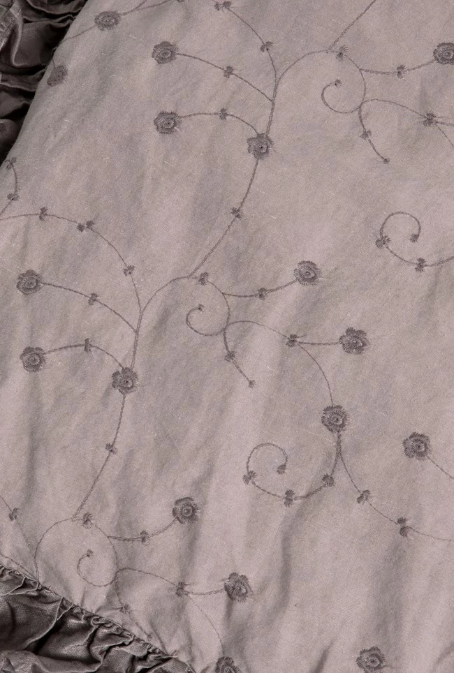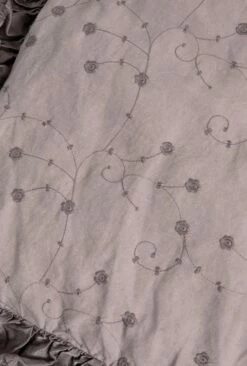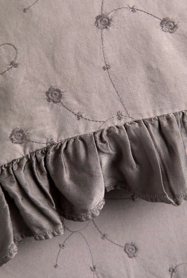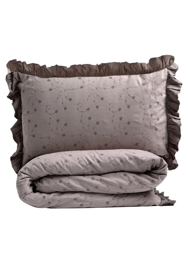 This feminine set has lovely embroidered linen in a pretty floral pattern and a satin frill around the edge. Shell buttons fasten the duvet cover, whilst the matching pillow cases feature an envelope opening.