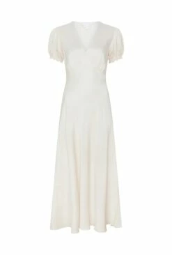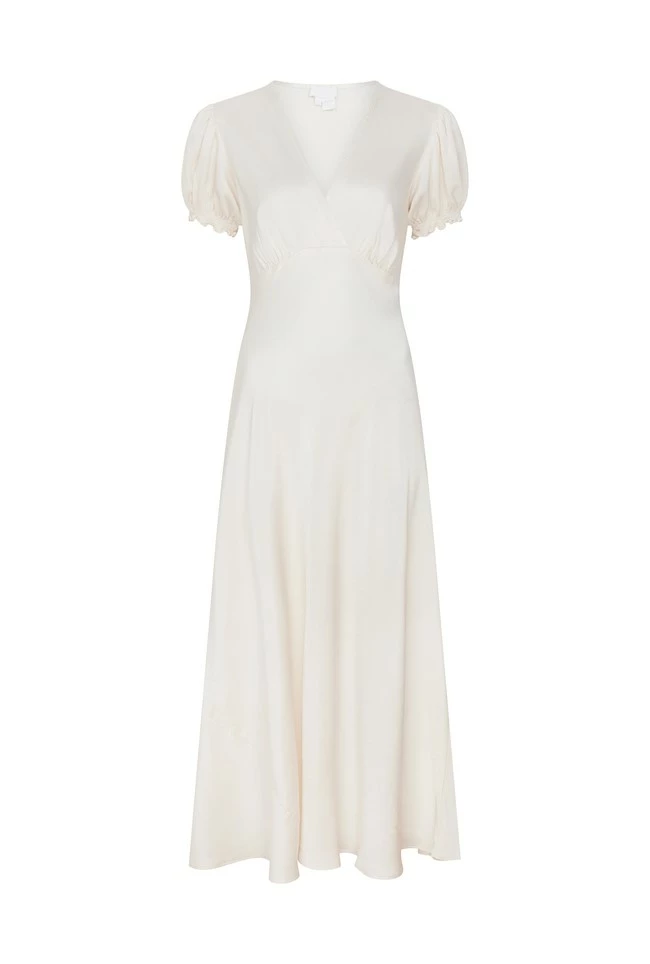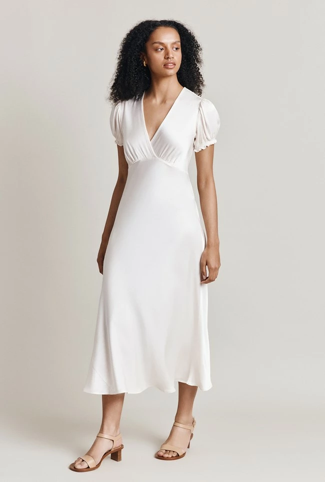 Clemence is a midi-length dress that features a mock wrap bust, creating a flattering silhouette that accentuates your curves. The shirred and ruffled cuffs bring a playful, feminine vibe. Crafted from high-quality heavy satin, this dress drapes beautifully and feels luxurious to the touch. Whether you’re attending a wedding, dinner party, or hitting the shops, Clemence will ensure you feel confident and stylish.
