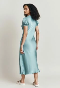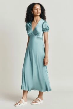 Clemence is a midi-length dress that features a mock wrap bust, creating a flattering silhouette that accentuates your curves. The shirred and ruffled cuffs bring a playful, feminine vibe. Crafted from high-quality heavy satin, this dress drapes beautifully and feels luxurious to the touch. Whether you’re attending a wedding, dinner party, or hitting the shops, Clemence will ensure you feel confident and stylish.