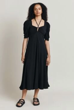 Clemence is a midi-length dress that features a mock wrap bust, creating a flattering silhouette that accentuates your curves. The shirred and ruffled cuffs bring a playful, feminine vibe. Crafted from high-quality heavy satin, this dress drapes beautifully and feels luxurious to the touch. Whether you’re attending a wedding, dinner party, or hitting the shops, Clemence will ensure you feel confident and stylish.