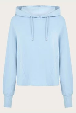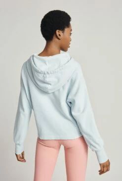 A cropped hoodie will never look out of place. From hitting the gym to running errands, everyone reaches for that one go-to casual hoodie. With seam and ribbed detailing and a boxy shape this hoodie in pale blue will match well with an array of leggings, joggers, jeans or trousers. With classic hoodie-style drawstring silver eyelet with toggle what really sells this jumper are the thumb holes everyone wishes they had – especially when the weather starts to get chilly.