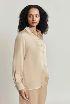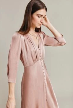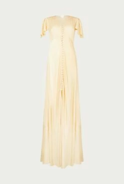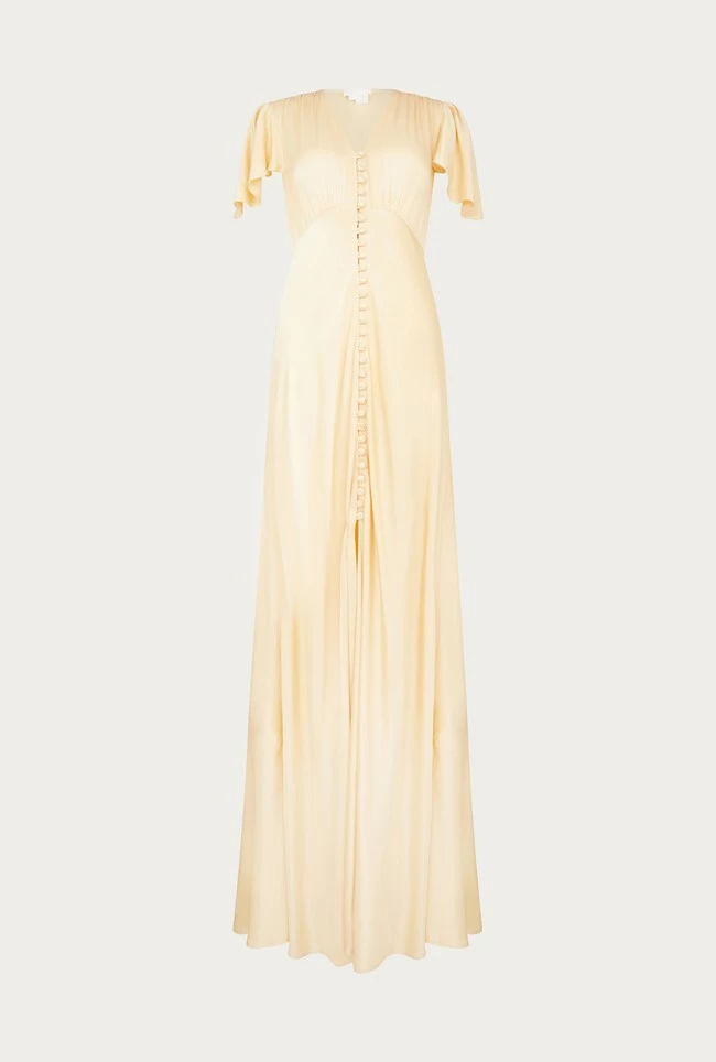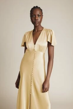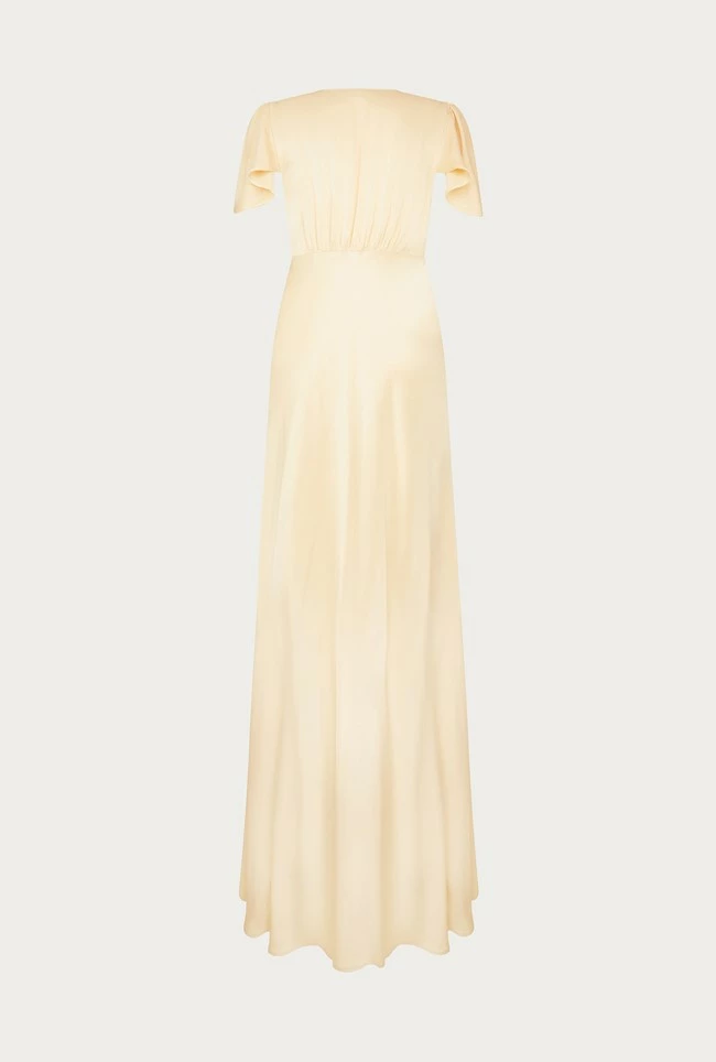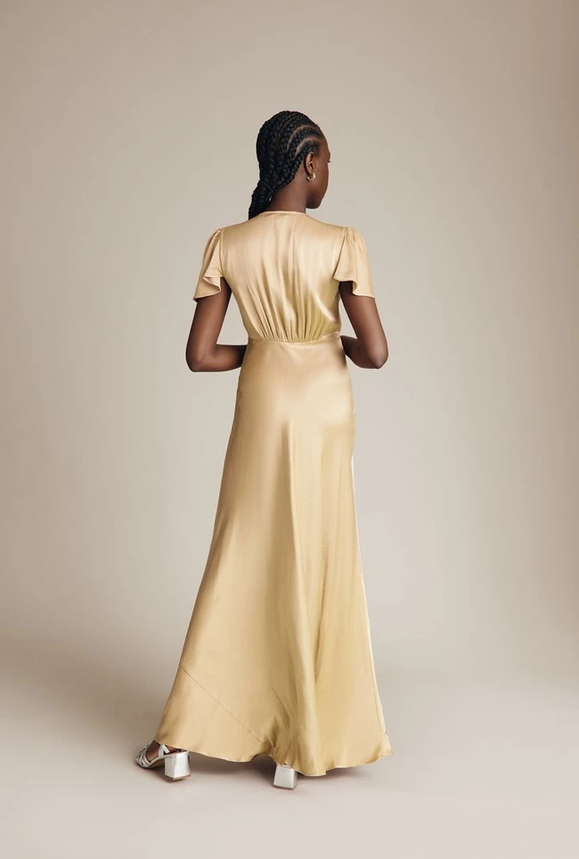 Vintage-like in silhouette and style, the Delphine in buttermilk is a timeless design. Cut into a gentle V-neck, its button-through front gives way to a split to create movement whilst walking and to showcase your choice of shoes and finishes with a train hem. Gathered detail around the shoulders and under the bust adds to its feminine appeal. Made from heavy satin fabric obtained from sustainable sources, it is cut on the bias for a flattering fit. Delphine is an occasion-wear must-have and would make a perfect bridesmaid dress.