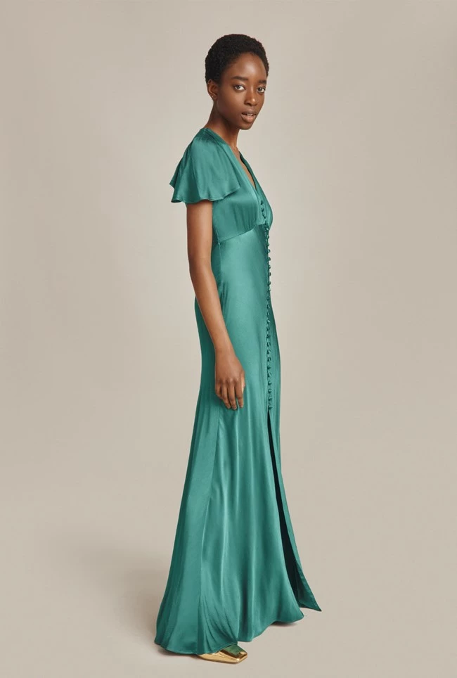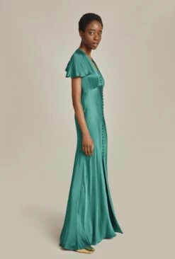 Vintage-like in silhouette and style, the Delphine in emerald sea green is a beautiful design. Cut into a gentle V-neck, its button-through front gives way to a split to create movement whilst walking and to showcase your choice of shoes. Gathered detail around the shoulders and under the bust adds to its feminine appeal. Made from heavy satin fabric obtained from sustainable sources, it is cut on the bias.