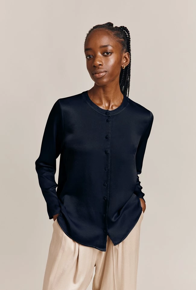 Say hello to your new go-to blouse – Efie. In a range of beautiful colours and crafted from our signature satin, Efie features simple straight sleeves, a round neckline to frame the face and front button detail. Pair with out Ella Trousers for the complete look.