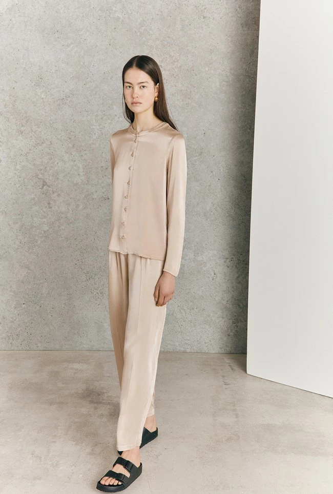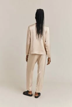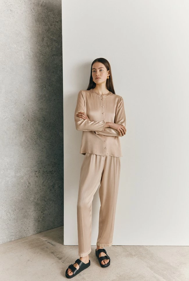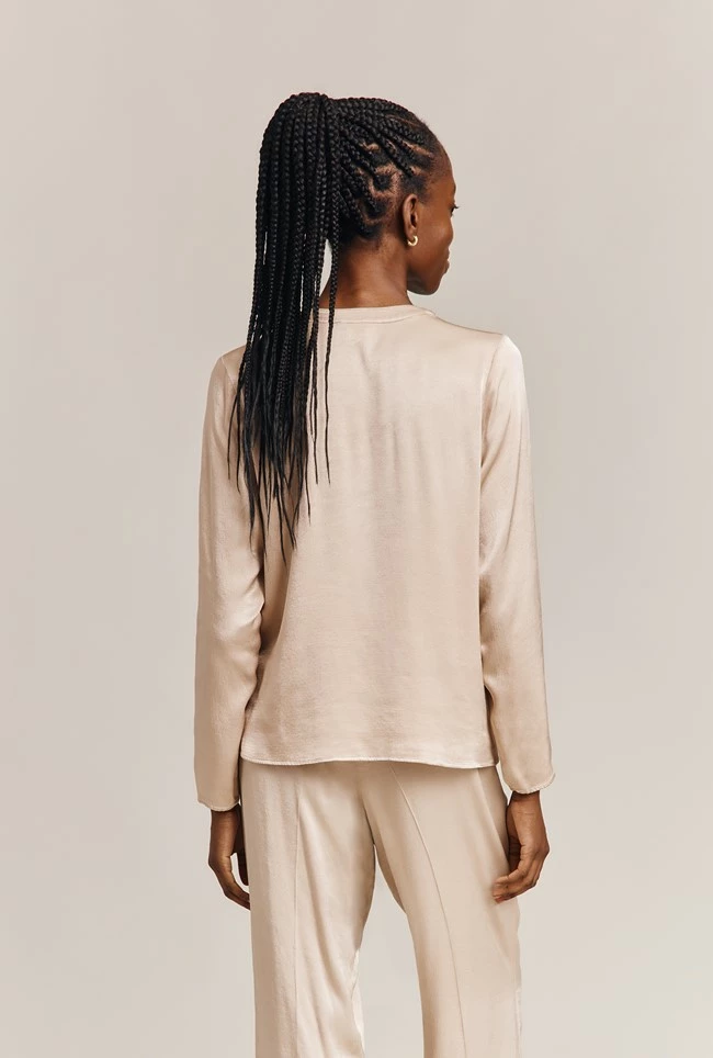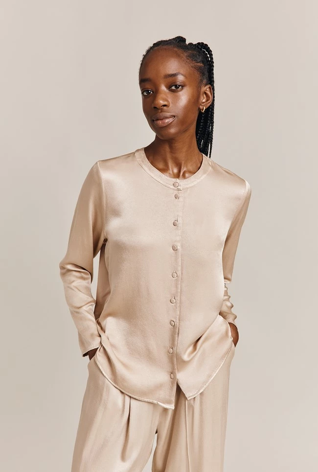 Say hello to your new go-to blouse – Efie. In a range of beautiful colours and crafted from our signature satin crepe, Efie features simple straight sleeves, a round neckline to frame the face and front button detail. Pair with out Ella Trousers for the complete look.