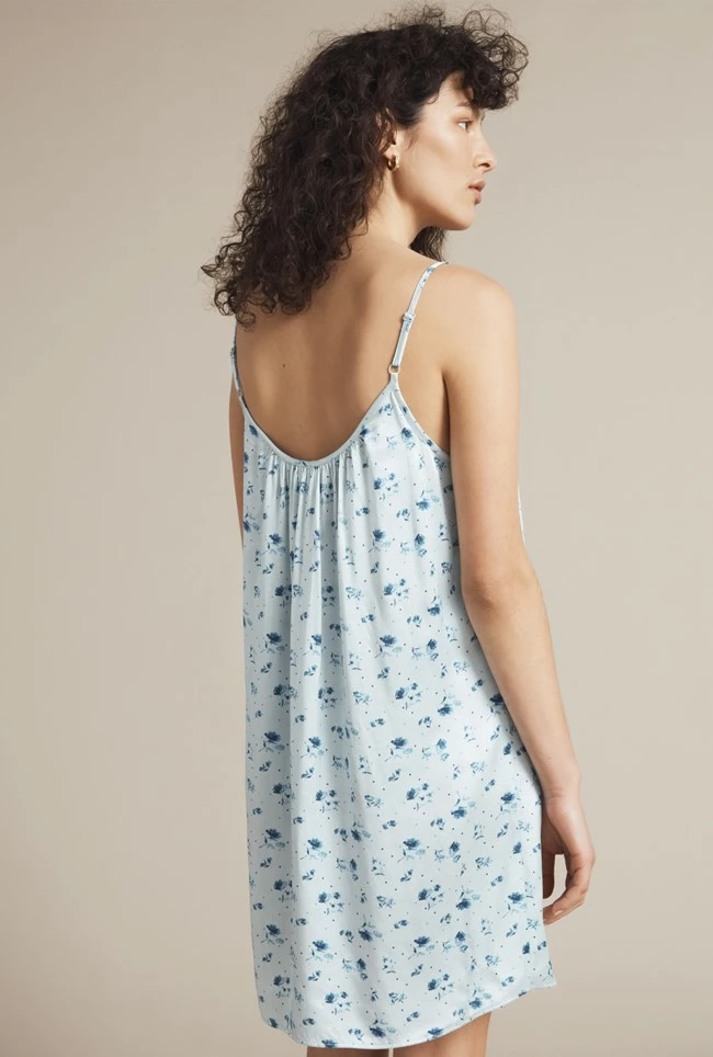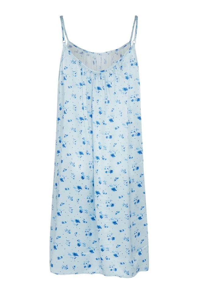 Keep your cool with our Ellen slip in gorgeous light blue rose dot floral. Made from filament satin this lightweight nightgown is designed to ensure freedom of movement and a comfortable fit. Falling above the knee and easy to wear this slip also features a flattering round neckline and delicate straps that cross over at the back for extra style. Match with some cosy slippers and our Alexa Robe for the finished night-time look.