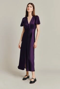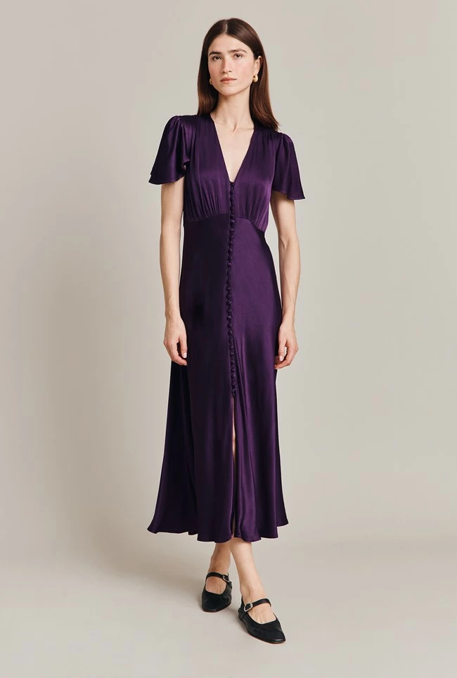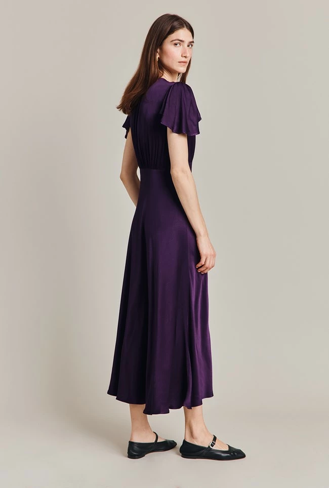 Inspired by vintage designs, it features a gentle V-neck and button-through front that gives way to an elegant centre split. With delicate angel sleeves and subtle gathered detailing around the shoulders and bust, it’s cut on the bias with an empire line for a flattering fit.