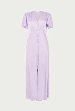 Based on our much-loved Delphine dress, Grace shares all of the same style signatures but has been reworked in a midi length. Inspired by vintage designs, it features a gentle V-neck and button-through front that gives way to an elegant centre split. With delicate angel sleeves and subtle gathered detailing around the shoulders and bust, it’s cut on the bias with an empire line for a flattering fit. Made from heavy satin fabric obtained from sustainable sources, Grace in dark green is an occasion wear must-have that makes a perfect bridesmaid dress.