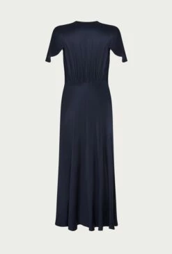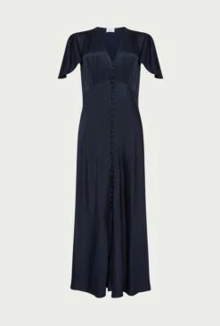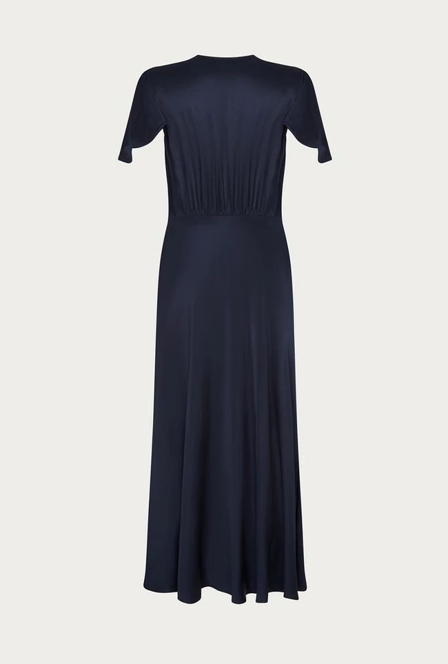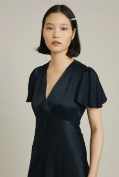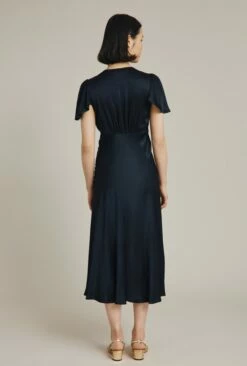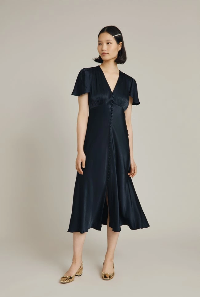 Based on our much-loved Delphine dress, Grace shares all of the same style signatures but has been reworked in a midi length. Inspired by vintage designs, it features a gentle V-neck and button-through front that gives way to an elegant centre split. With delicate angel sleeves and subtle gathered detailing around the shoulders and bust, it’s cut on the bias with an empire line for a flattering fit. Made from heavy satin fabric obtained from sustainable sources, Grace in navy is an occasion wear must-have that makes a perfect bridesmaid dress.