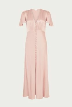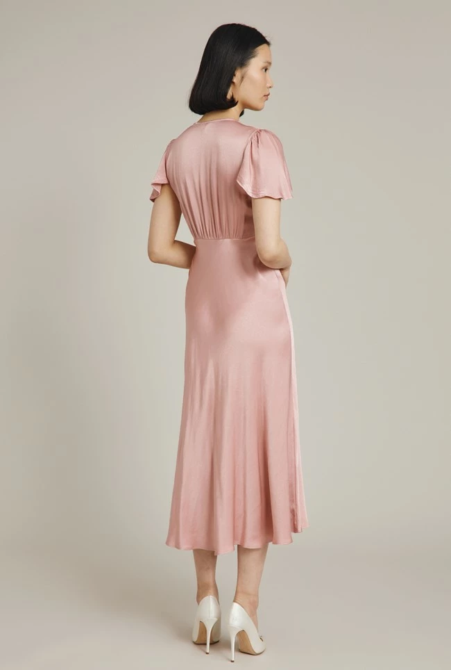 Based on our much-loved Delphine dress, Grace shares all of the same style signatures but has been reworked in a midi length. Inspired by vintage designs, it features a gentle V-neck and button-through front that gives way to an elegant centre split. With delicate angel sleeves and subtle gathered detailing around the shoulders and bust, it’s cut on the bias with an empire line for a flattering fit. Made from heavy satin fabric obtained from sustainable sources, Grace in rose is an occasion wear must-have that makes a perfect bridesmaid dress.