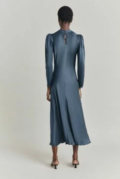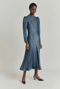Skimming the silhouette beautifully, Harper is a midi dress that provides full coverage for the cooler temperatures, thanks to her long sleeves and high neckline. Crafted from our signature satin fabric, her puffed shoulders and ruched sleeves add structure to this simple yet sophisticated style.