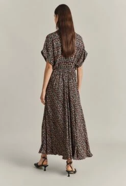 Harriet is a long midi dress in a soft tribal print, crafted from our heavy crepe fabric. It features a high neckline and capped sleeves, finished with cuff detail. Wear with ankle boots or heels.
