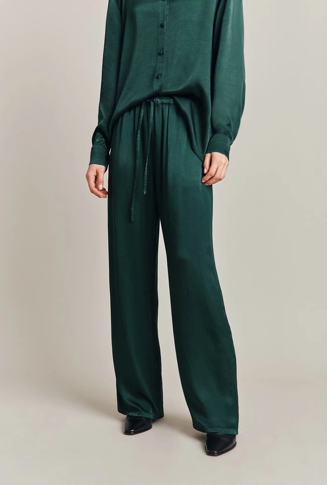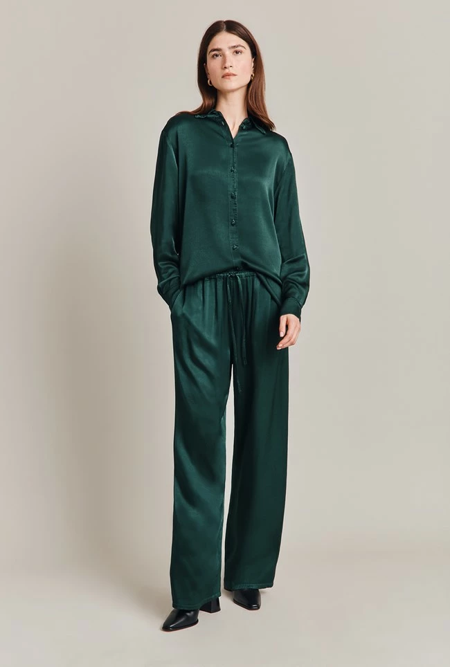 For flattering trousers that ooze comfort, look no further than Imogen. Made from our fluid garment-dyed Eco Vero satin, these wide leg Palazzo-style trousers offers a looser fit and are perfect for colder days when you want a little extra coverage. With an adjustable drawstring waist and handy side pockets these trousers are made for functional comfort. Tuck in a plain white tee or match with our Ellie shirt or Jana cami.
