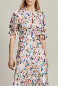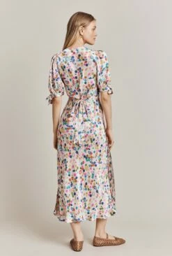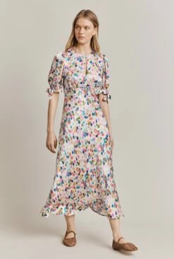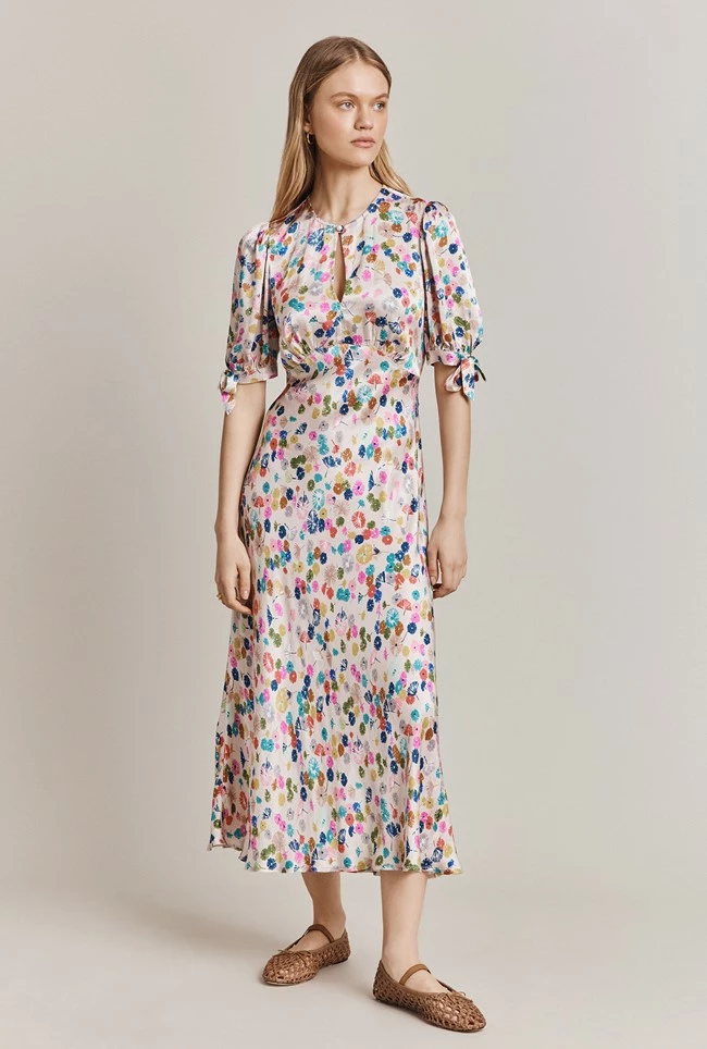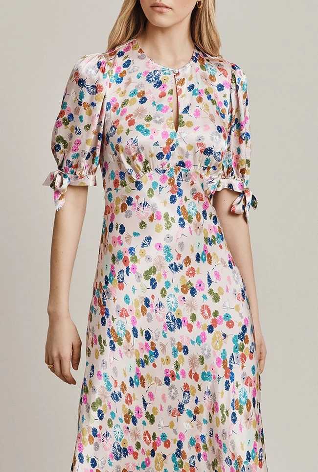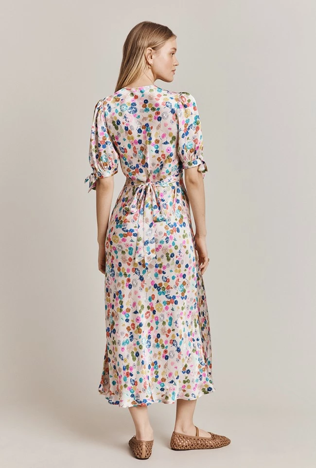 Josephine is a midi dress crafted from our luxuriously soft satin, in a feminine floral print that has been uniquely hand-drawn by our in-house design team. The front keyhole opening features a gorgeous pearl button, short voluminous sleeves feature tie cuff detail which matches the tie waist detail that flatters every figure. From weddings to weekends away, she will be your perfect companion for every event this summer.
