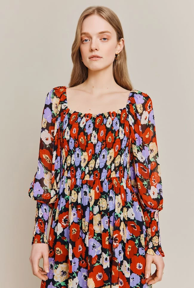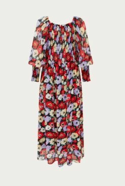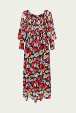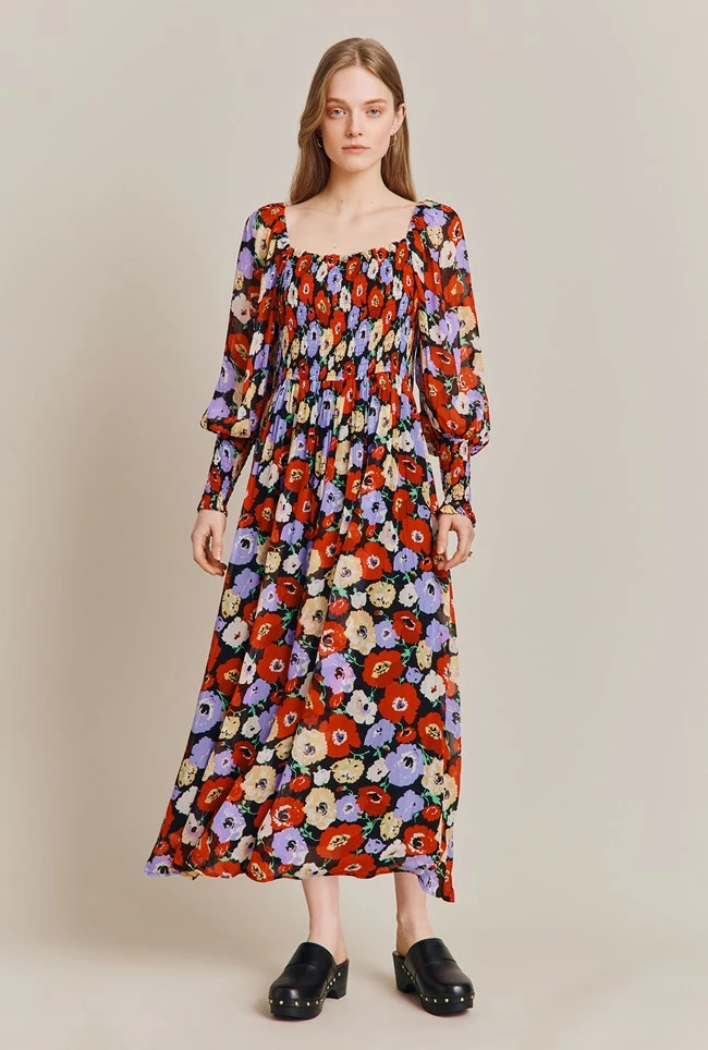 Kristie is a long midi dress in an eye-catching poppy print. Bias cut and fully lined in our georgette crepe fabric, itโs the ideal statement dress. It features a strong square neckline and long sleeves finished with deep shirred cuffs.
