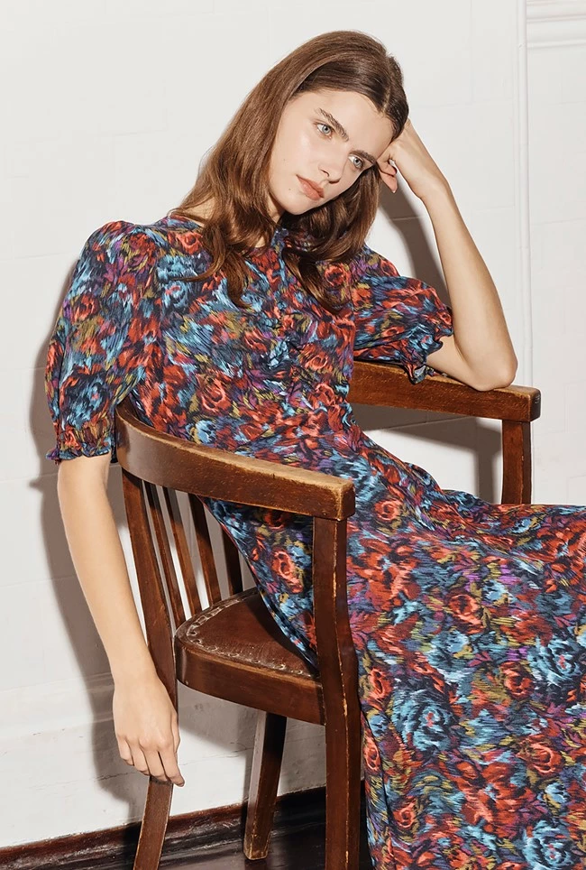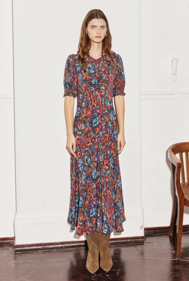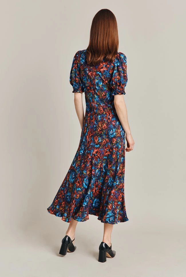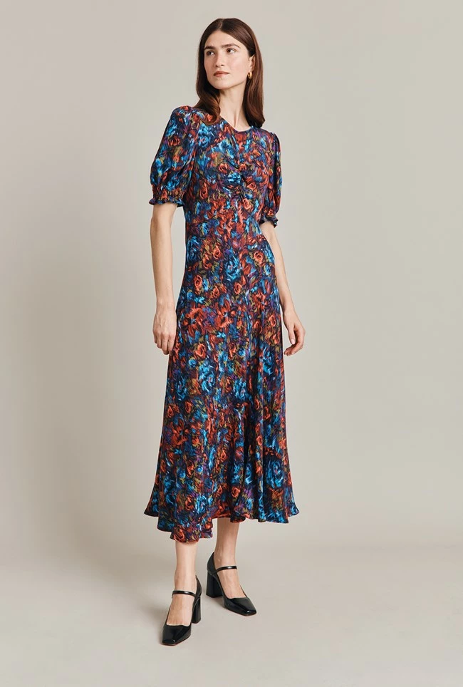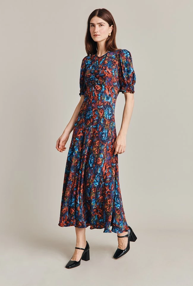 In a gorgeous abstract floral print, Lainey is midi in length and crafted from our winter crepe. Fit and flare in style, she features a flattering empire line bust and a ruched mid seam. Short sleeves with shirred cuffs add yet more volume to this flattering style. Layer over a jacket and wear with your favourite ankle boots.