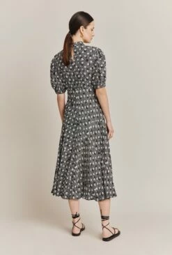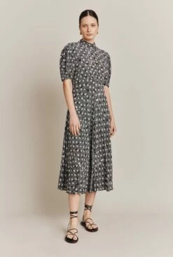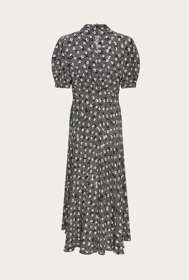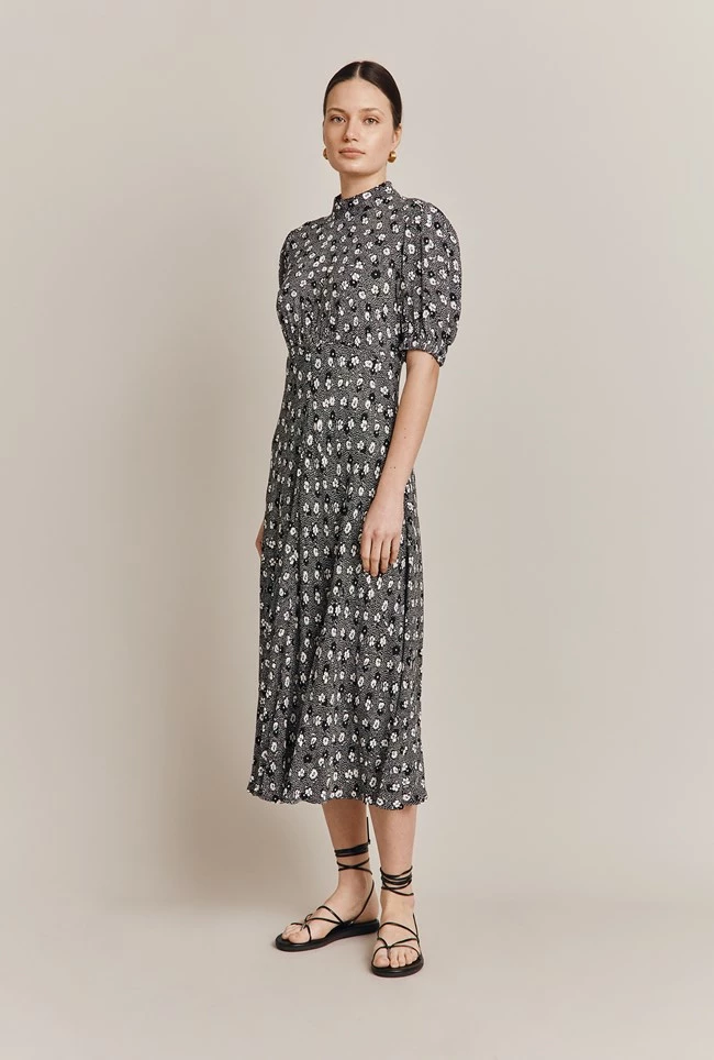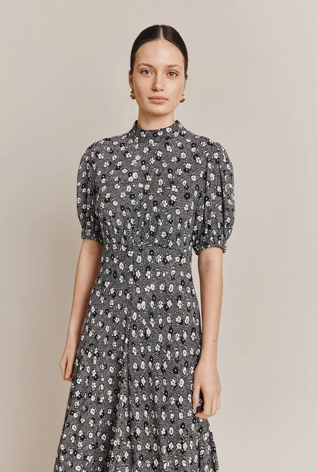 Our best-selling Luella dress returns in a playful daisy print. This design’s high neckline, voluminous sleeves and seam detail bodice make for a chic and universally flattering silhouette. Made from soft crepe, it moves beautifully and blends well that desirable line between effortlessly dressed up and casual.