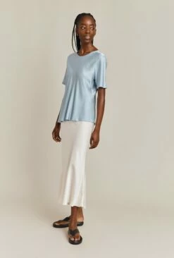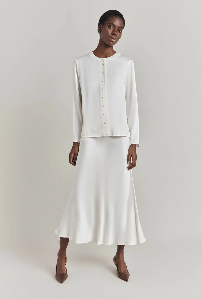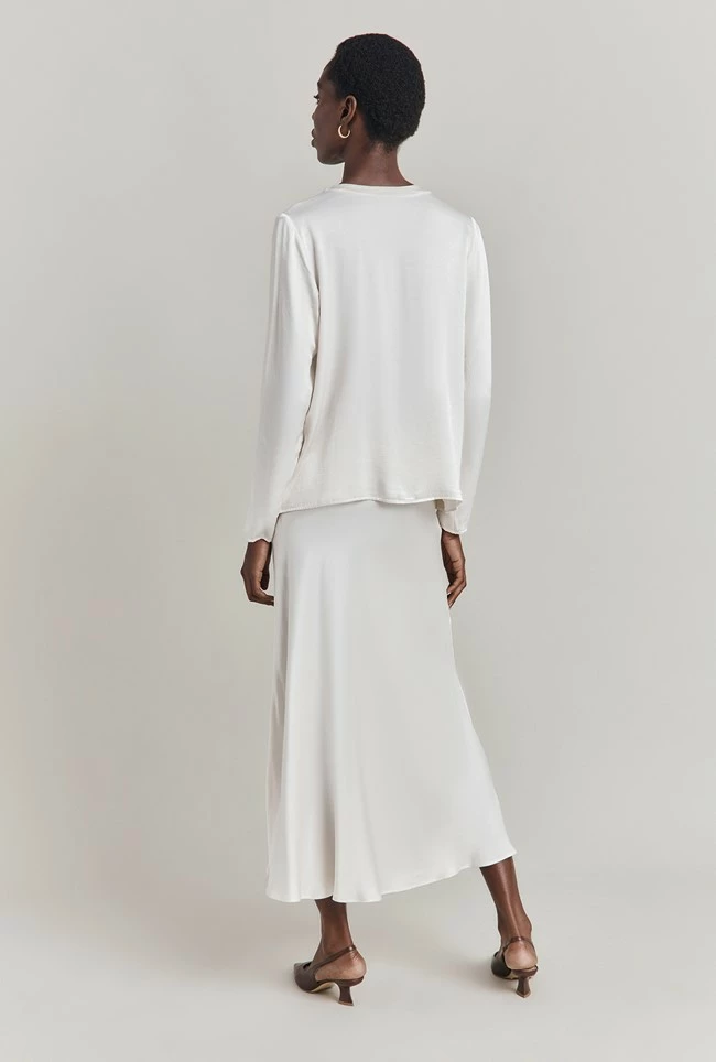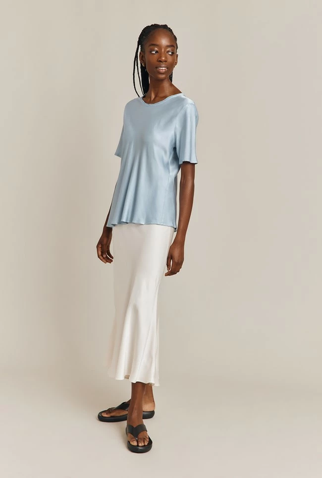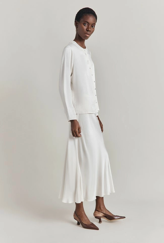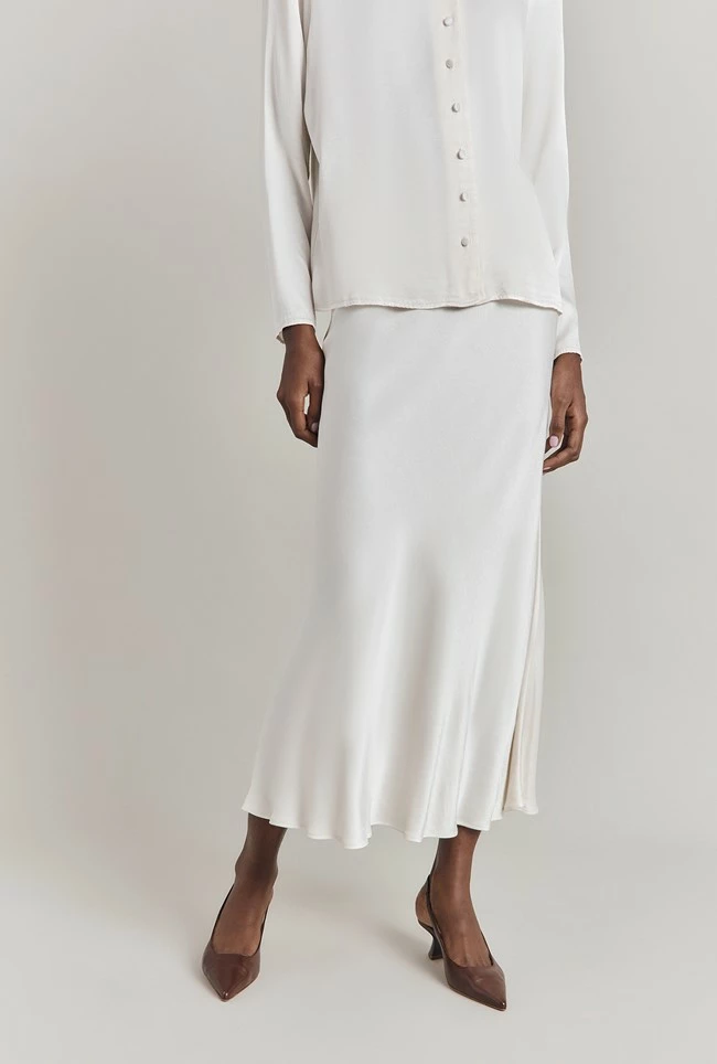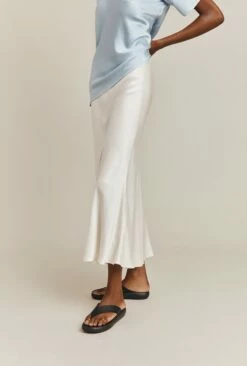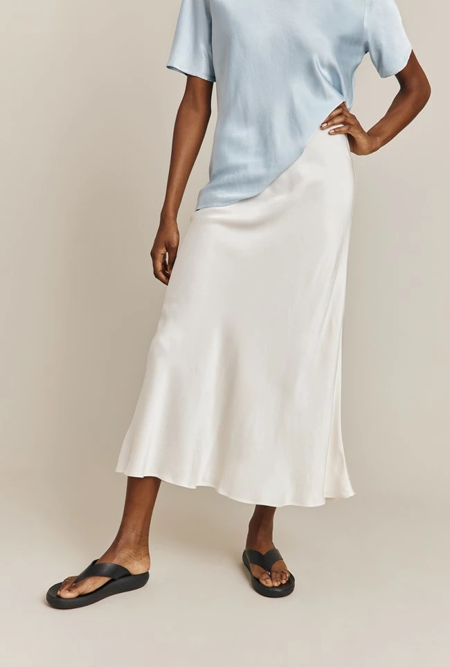 If you only have one skirt in your wardrobe, make it Luna. A true classic, this simple skirt is cut on the bias in a midi length and crafted in garment-dyed satin so it falls fluidly over the body to create a flattering, form-fitting silhouette. A subtly elasticated waistband ensures comfort. Dress up with a satin camisole and heels, or down with a simple tee, denim jacket and trainers – versatility is Luna’s superpower.