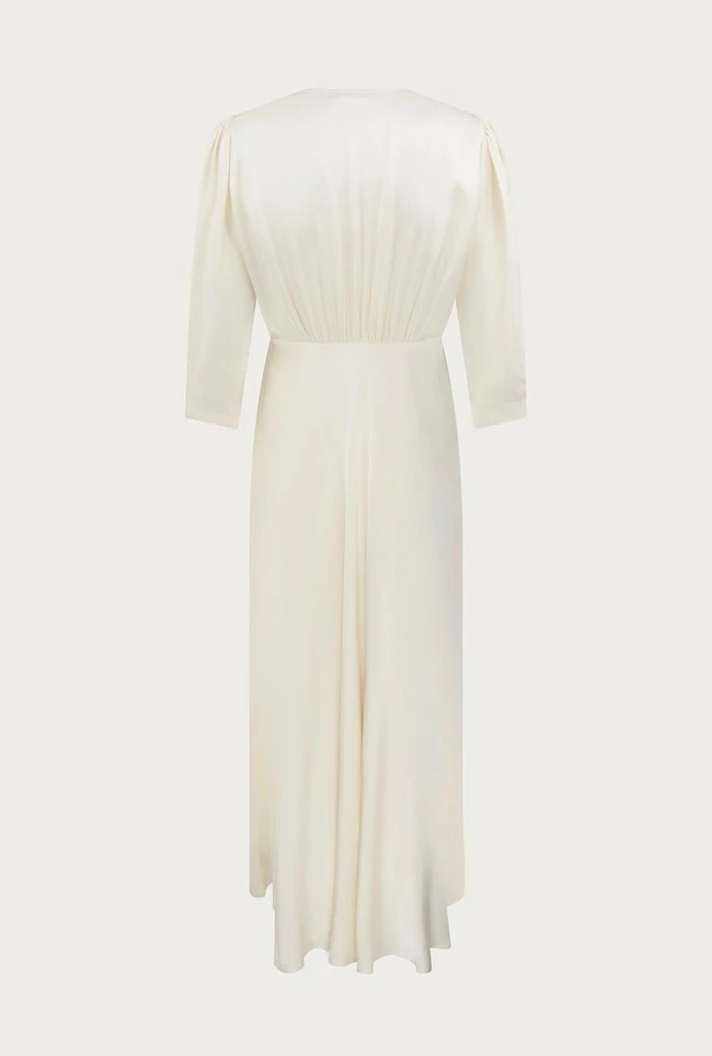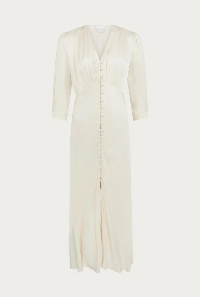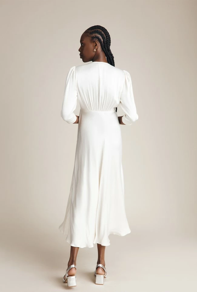 If you need a simple yet striking showstopper outfit, look no further than our Madison dress. Cut from sustainable EcoVero heavy satin, this vintage-inspired style features puffed shoulders, fabric covered buttons and three-quarter length sleeves. With a classic silhouette and front split detail, this ultra-feminine dress will endure season after season – plus it would also make the perfect bridesmaid’s dress.