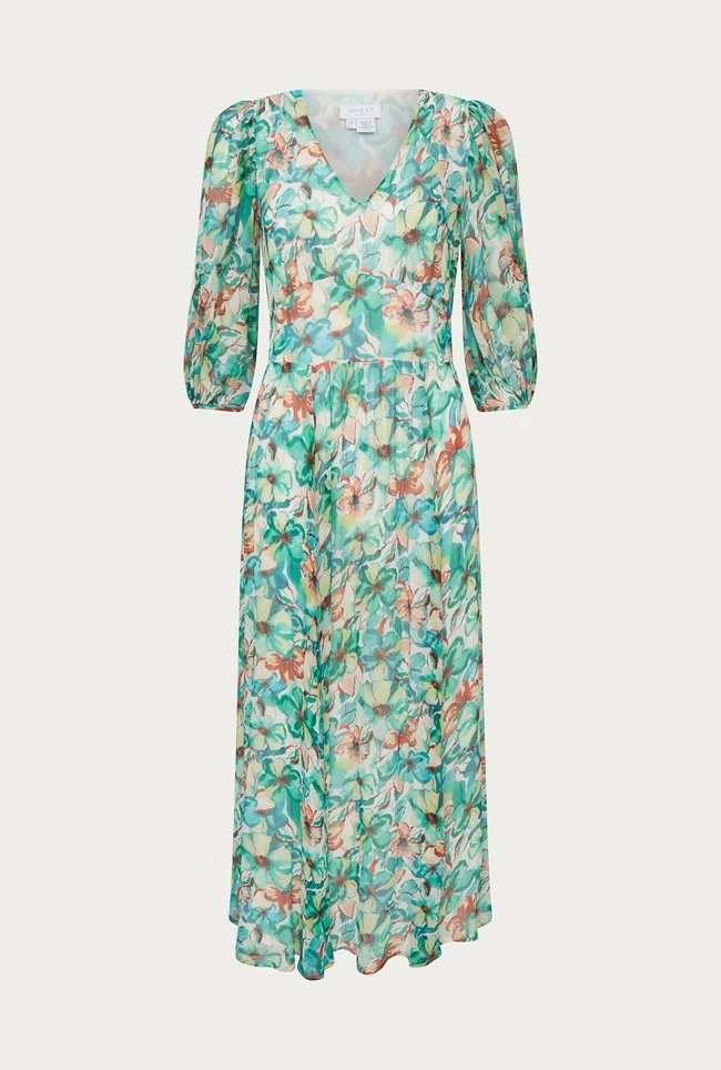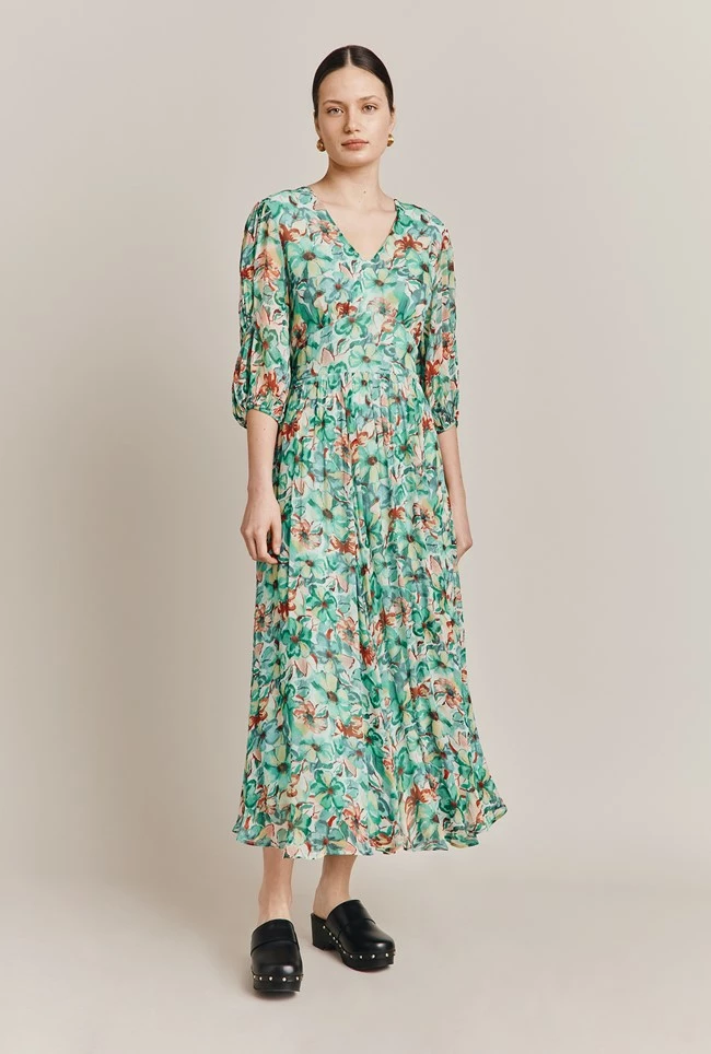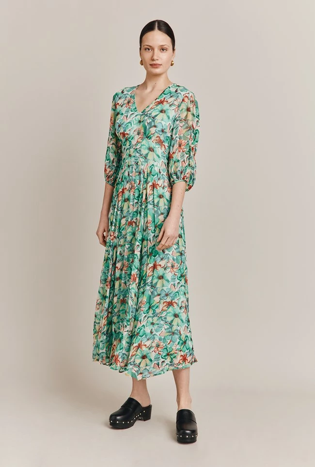 Meet Margot, a dream midi dress in a vintage floral print. Fully lined and effortlessly light thanks to our signature georgette fabric, Margot has a soft V-neck and a shaped waistband for extra definition. The three-quarter length sleeves with gathering detail and the gently voluminous skirt add to Margot’s romanticism.