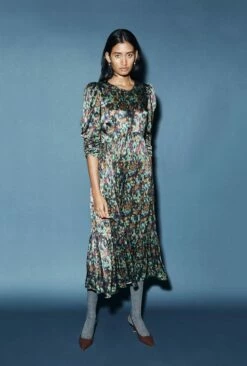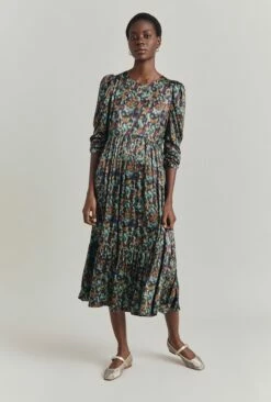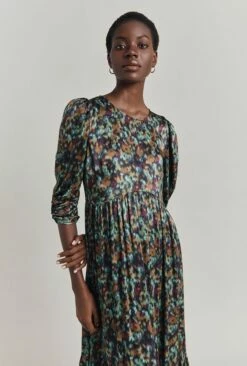 Cut from our signature satin, Maya is a midi dress with a tired hemline that creates a voluminous skirt. With an empire line bust, and gorgeous ikat print, Maya also features three-quarter length sleeves with ruched detail and key hole back detail. Wear with ankle boots and later over a stylish jacket.