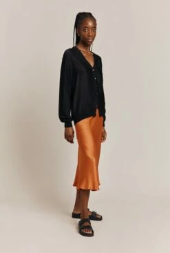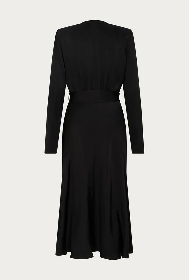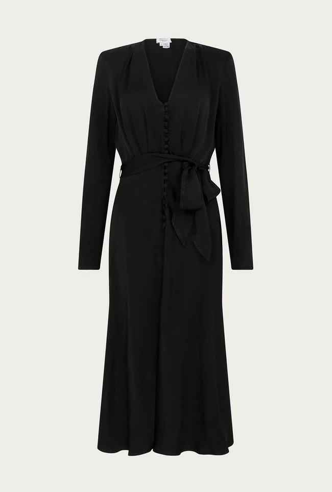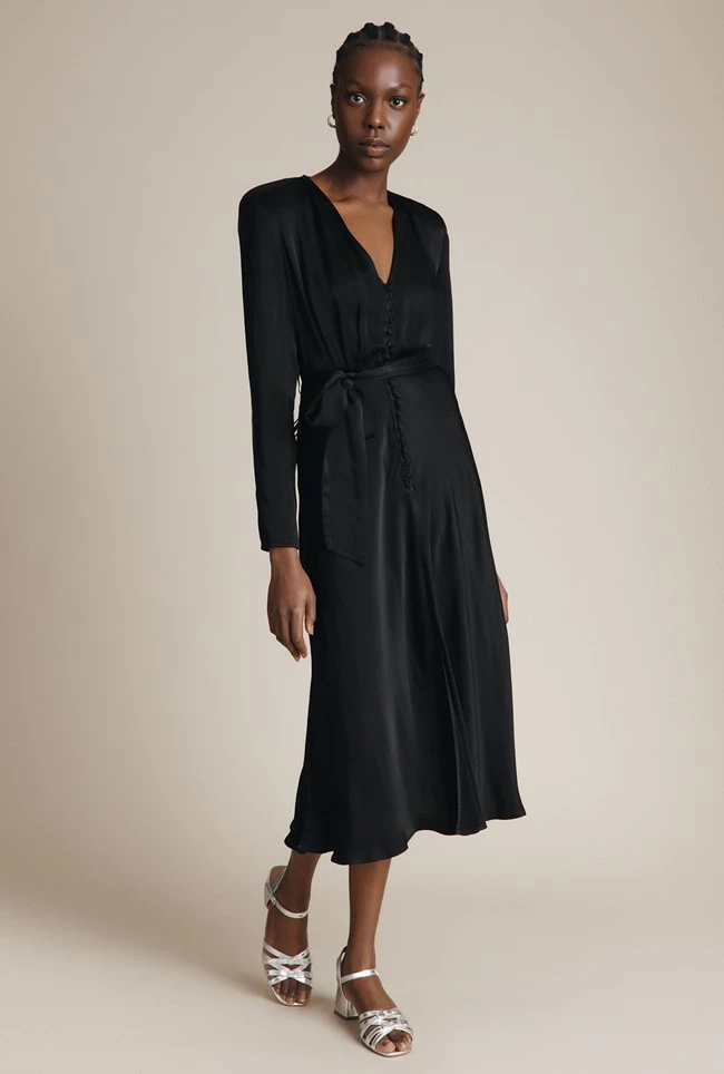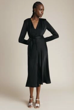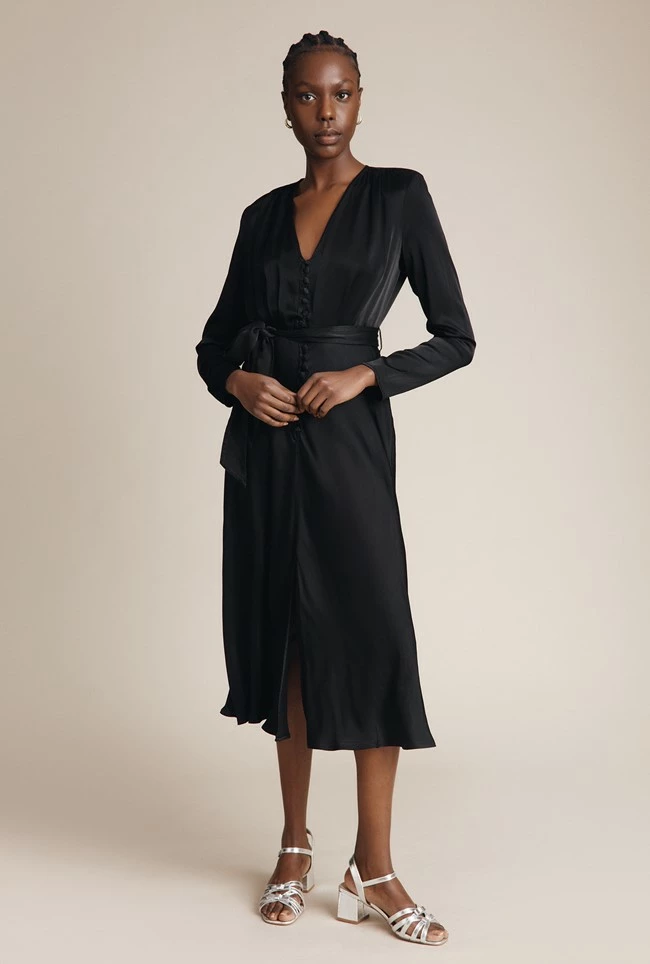 Designed in stunning satin, our knee-length Meryl dress in black is a pretty button-through style that features pleats at the padded shoulders, seaming at the waist for a glamorous silhouette and a wrap tie to complete the elegant look. The bias-cut skirt makes for a flattering fit, while the front split adds a touch of femininity showcasing just the right amount of leg. Wear yours with stylish heels for a cocktail party or dinner date – plus it would also make the perfect bridesmaid’s dress.