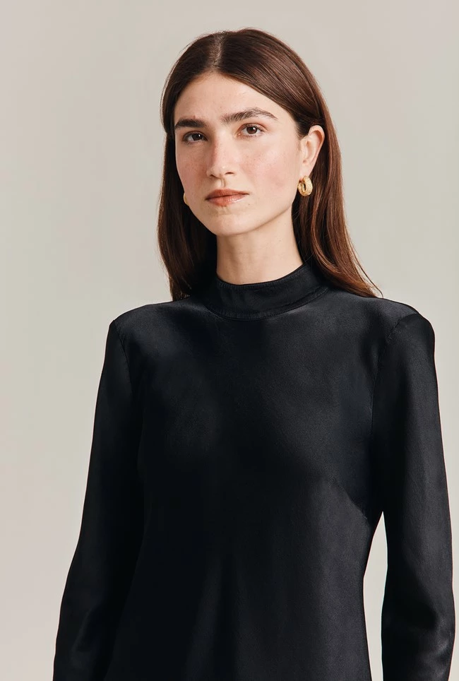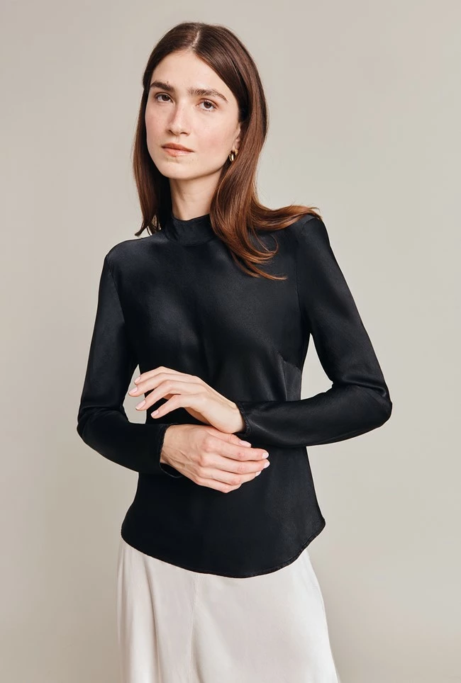 Meet Mika, our mock turtleneck top, crafted from our heavier satin – perfect for the cooler temperatures. Bias cut for a flattering fit, she features a rear keyhole and button fastening. Pair with our Clara Trouser or Imogen Trouser, and layer over a leather jacket.