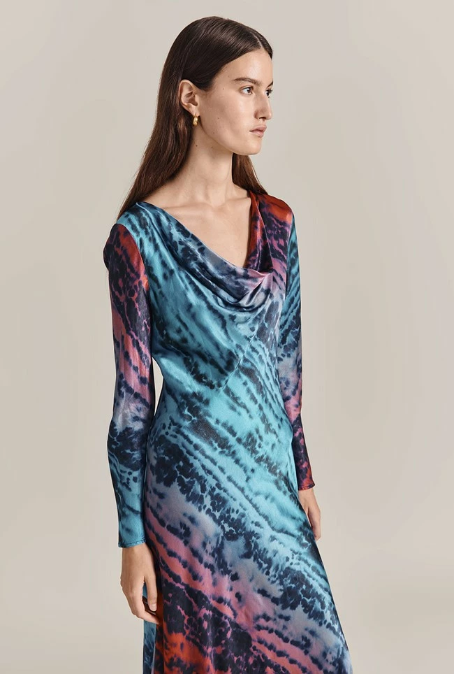 Milana perfectly blends the line between elegant and bohemian. Featuring an on-trend cowl neck, she is crafted from luxurious satin in a gorgeous tie-dye print. A maxi length dress, Milana has long straight sleeves and provides the right amount of coverage for the colder weather.