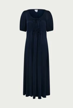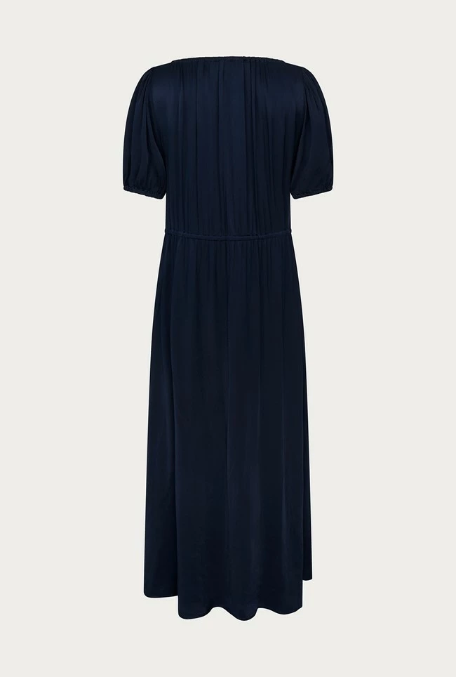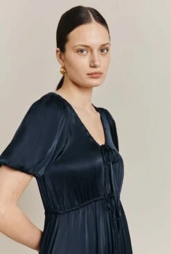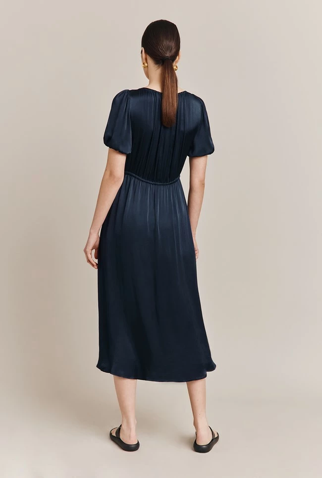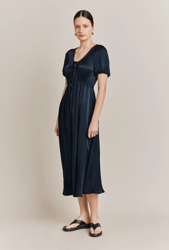 We love Morella, in our classic filament satin. Midi in length with drawstring detail at the bust and waist, she frames the face beautifully and pulls in at the waist for a flattering fit. Short, voluminous sleeves feature elasticated cuffs, to add volume to this simple yet stylish wardrobe must-have.