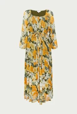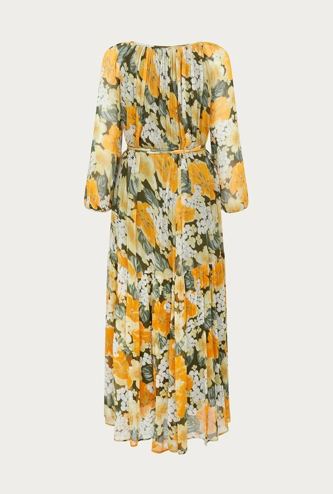Floral dresses donโt get better than Pandora. In a gorgeous hydrangea print on our signature georgette, Poppy features a square neckline a tie waist and a tiered midi length skirt. The long voluminous sleeves flow into on-trend elasticated cuffs and adds to the fit and flare style. Pair with wedges or ankle boots.