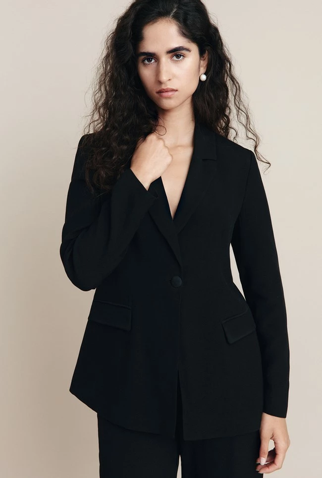 Piper is a classic, semi-fitted tailored jacket with a revere collar and one-button fastening. Fully lined and crafted in satin-back crepe, it features two flap pockets and a vent at the back for comfort and ease of movement. Piper pairs perfectly with our Alexa trousers, but looks just as good over a simple slip dress.