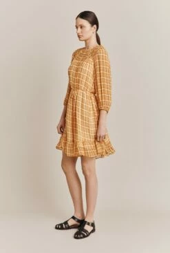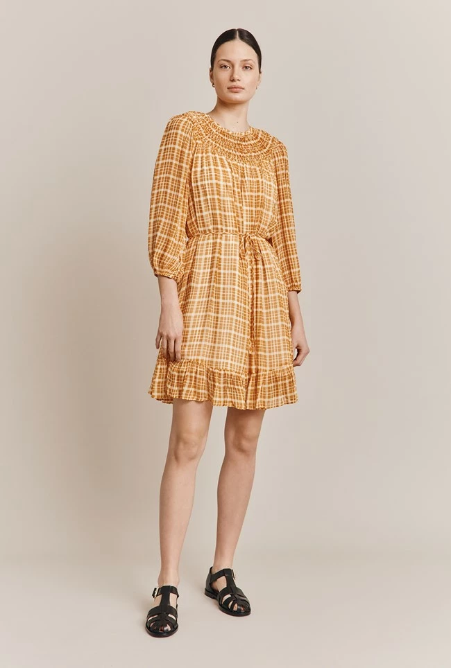 We simply love our Poppy dress in gingham, crafted from our signature georgette. The hand-sewn smocked neckline frames the face, before falling into a floaty and fluid dress. Above the knee in length, a tiered hem and tie waist give this dress an on-trend twist. As does the long voluminous sleeves with elasticated cuffs.