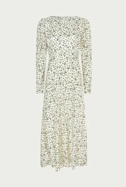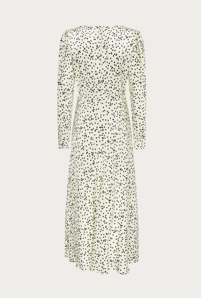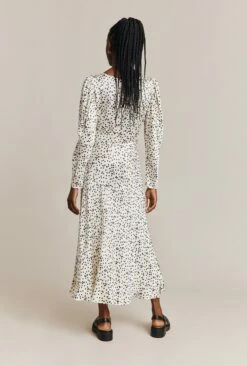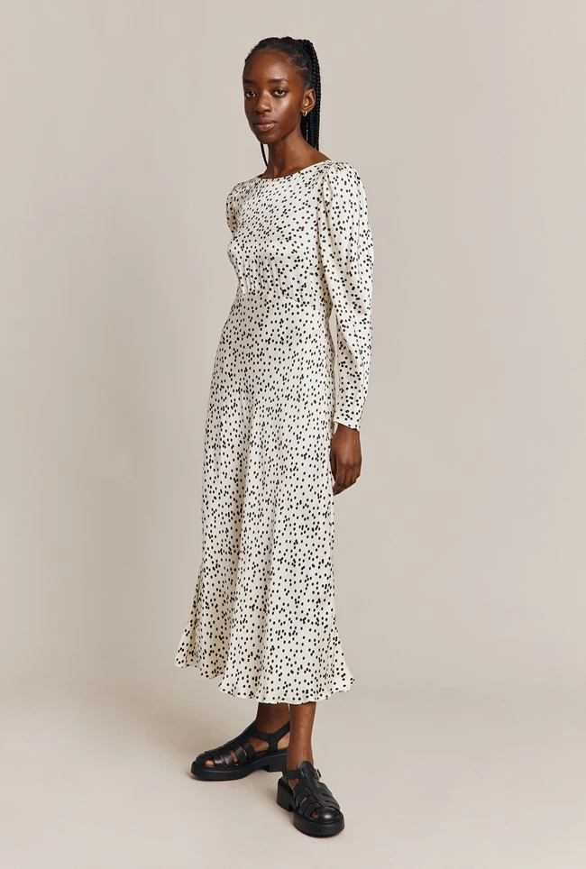 The printed Rosaleen dress offers endless styling options – whether it’s a relaxed daytime look or elevated for evening. A spot print adorns this dress for a fresh colour contrast. Cut from lightweight satin, it features gently puffed sleeves, giving a nod to the glamour of the 1930s, and an elegant keyhole opening at the back.