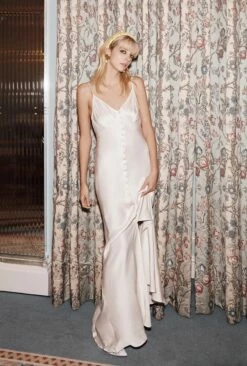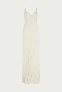 Make Sariyah your go-to party dress this season. A classic slip dress with adjustable straps, Sariyah is as elegant as they come. Crafted from luxuriously soft satin in ivory with a button-through front that gives way to a split, she skims the silhouette beautifully. Dress up with heels and a statement clutch.