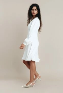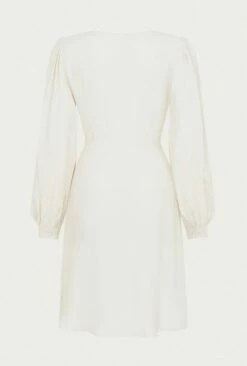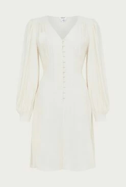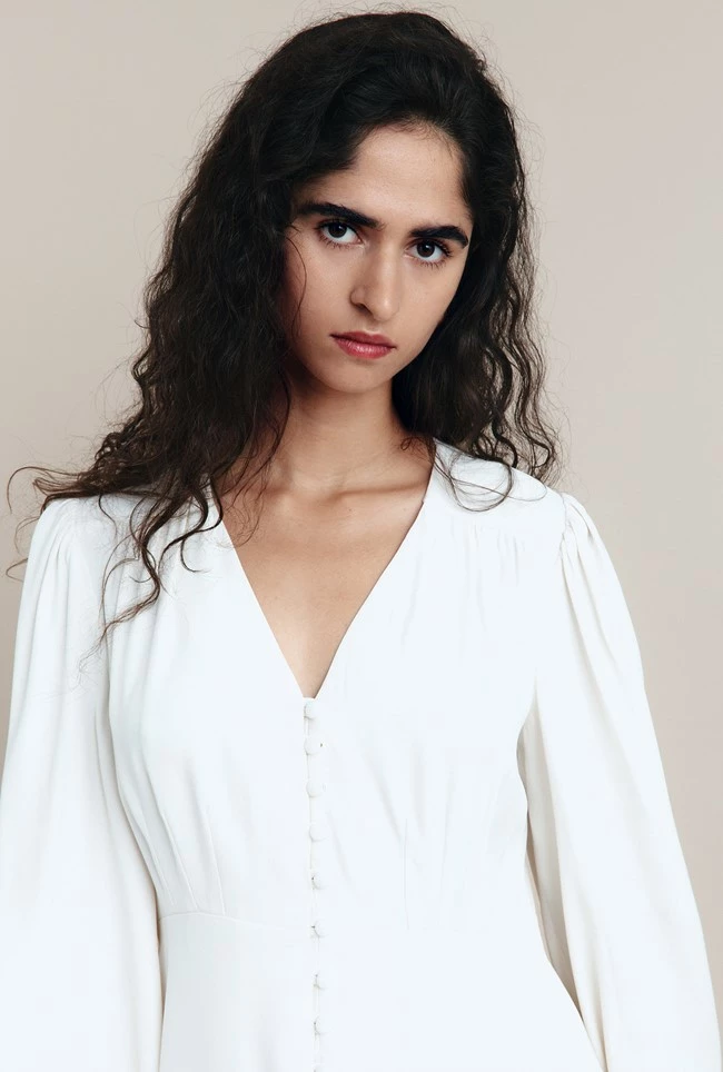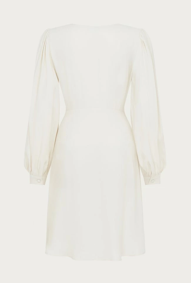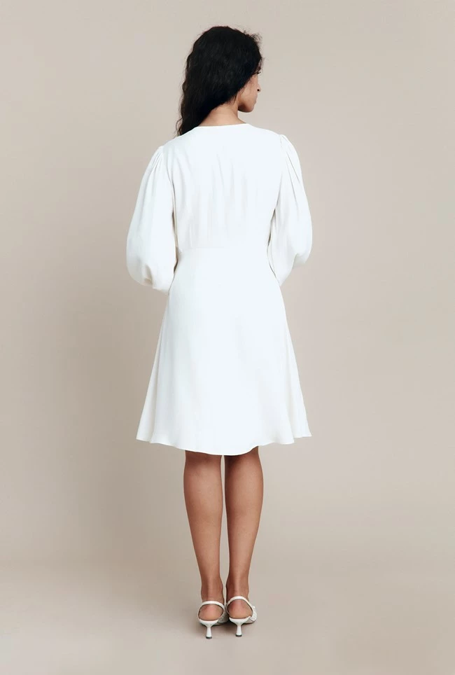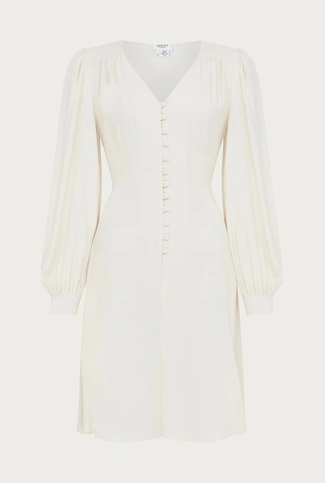 Crafted in our signature satin-back crepe, Shyla is a simple knee-length dress that’s perfect for any occasion and would even make a beautifully contemporary bridal dress. It features a flattering v-neckline, fluid skirt and delicate covered-button detailing at the front and on the cuffs. The subtly voluminous sleeves add a statement element while also nodding to the vintage inspiration that imbues many of Ghost’s designs.