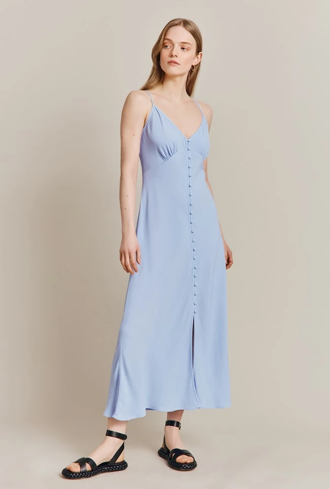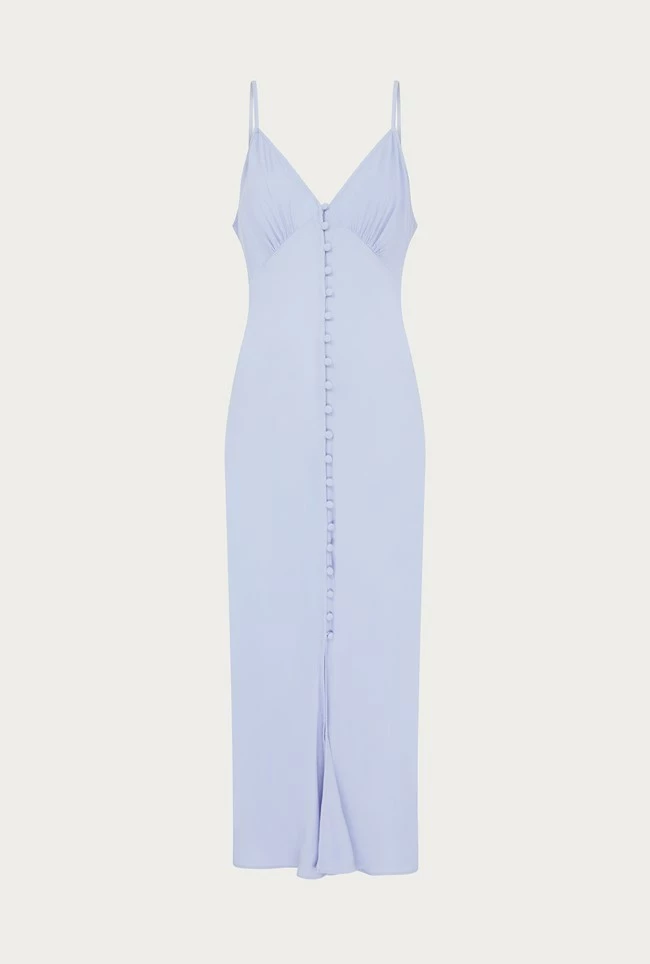 Make Sofia your go-to summer frock this season. A classic slip dress with adjustable straps, Sofia is crafted from luxuriously our soft and lightweight summer crepe with a button-through front that skims the silhouette beautifully. Dress up with heels and a statement clutch or down with sneakers and a denim jacket.