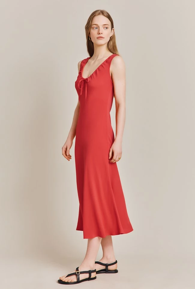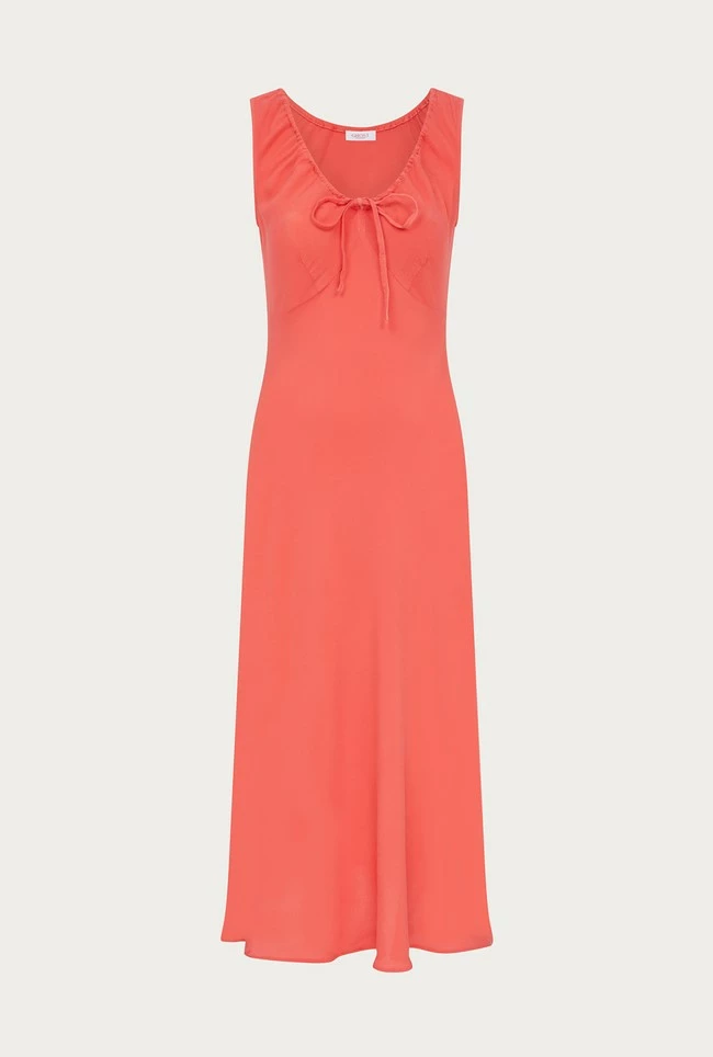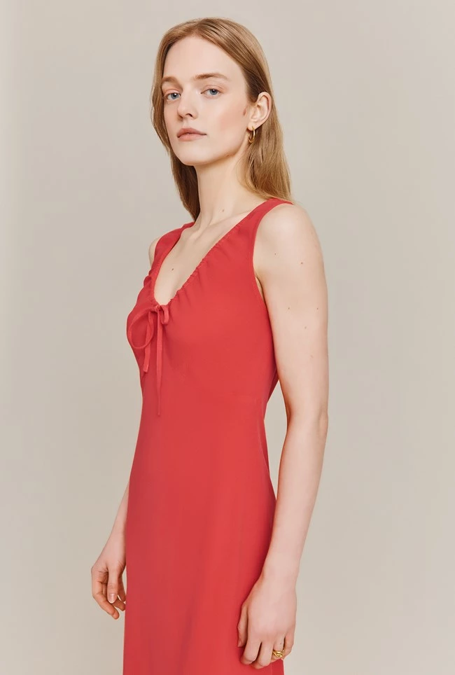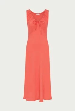 A midi-length stunner, Trixie features a deep round neckline and tie bust detail that offers a chic and sophisticated look. The empire line bust and wide straps provide both comfort and style. Made from high-quality crepe, this dress is perfect for any occasion this summer.