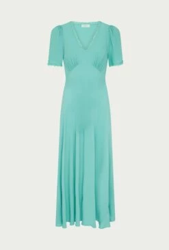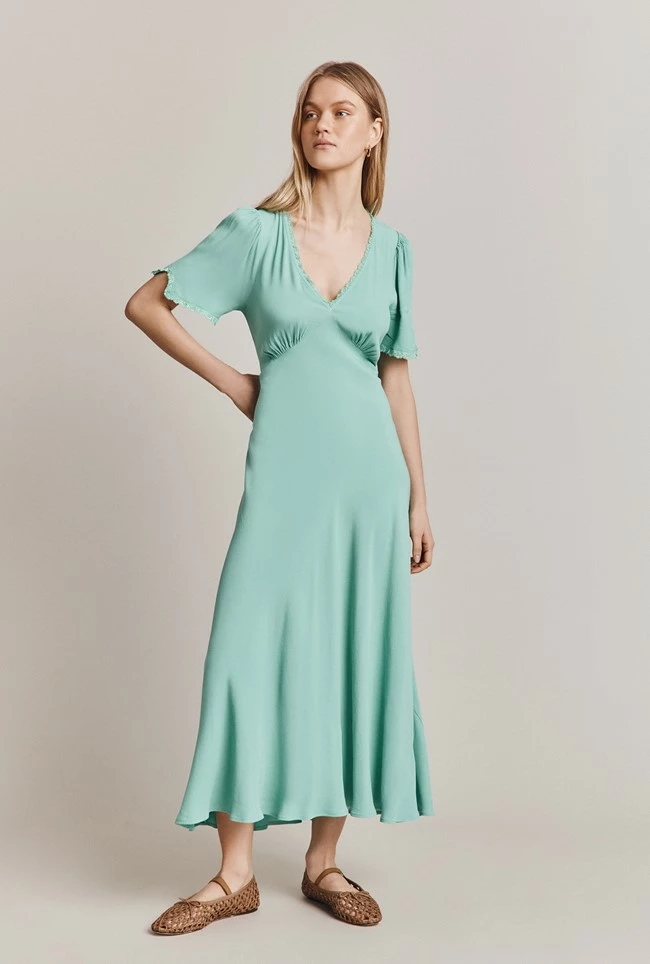 Introducing Victoria, crafted from high-quality crepe fabric, which gives it a luxurious feel and elegant drape. The dress features angel style short sleeves and an empire line bust that adds a touch of grace and sophistication to the overall design. The ruffled neckline enhances the natural curves of the neck and collarbone, giving you an effortlessly chic look.