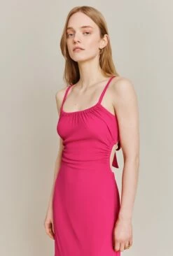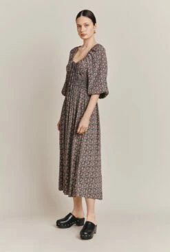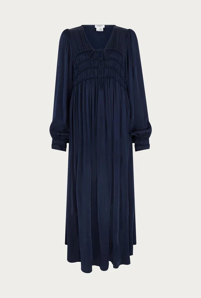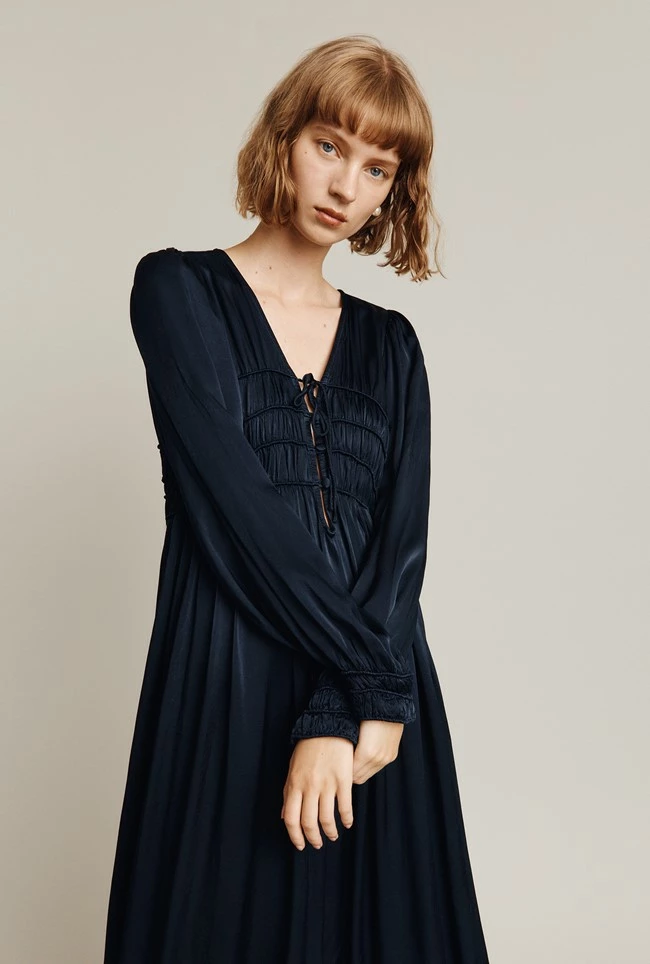 Crafted from our signature soft satin, Violet is a classic style with plenty of on-trend details. Note the cut out detail with covered buttons and tie fastening, in between a shirred bust. We love the matching shirred cuffs on her long voluminous sleeves. Perfect for dressier occasions or the office, Violet is a winter wardrobe must-have.
