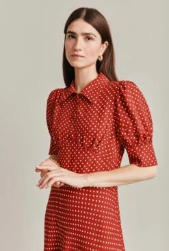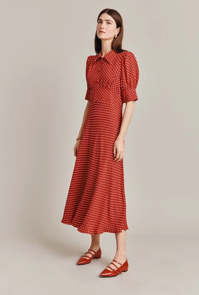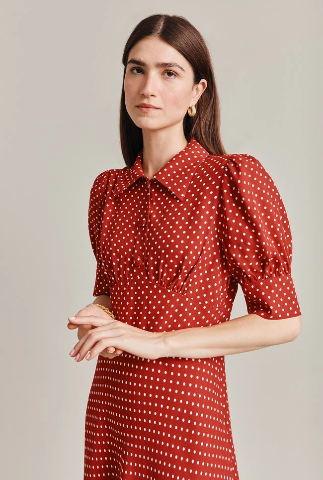 Wilma is your new go-to dress for any formal occasion you have in your diary. Studded with beautiful vintage-look buttons from Italy at the neck and cuffs, it has a Fifties feel that makes it perfect for occasions that require a smart, sophisticated look. A panel at the waist creates a fitted silhouette that leads into a bias cut skirt, while a hidden inner frill at the shoulder adds volume to the puff sleeves. Satin-back crepe keeps the dress soft against the skin but matt on the exterior.