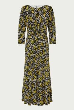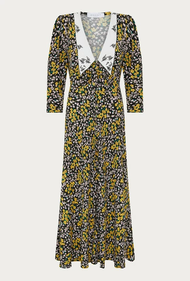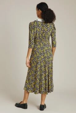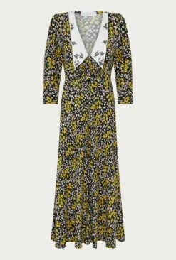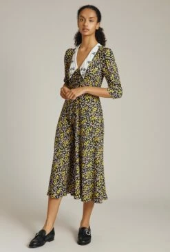 Our knee-length Wynn dress will have you turning heads no matter what the occasion. What truly stands out is the stunning embroidered crepe collar that contrasts beautifully with the yellow bouquet print. Buttoned through to create a flattering silhouette, Wynn also features three-quarter length sleeves. Dressed up or down, this is a winter wardrobe necessity.